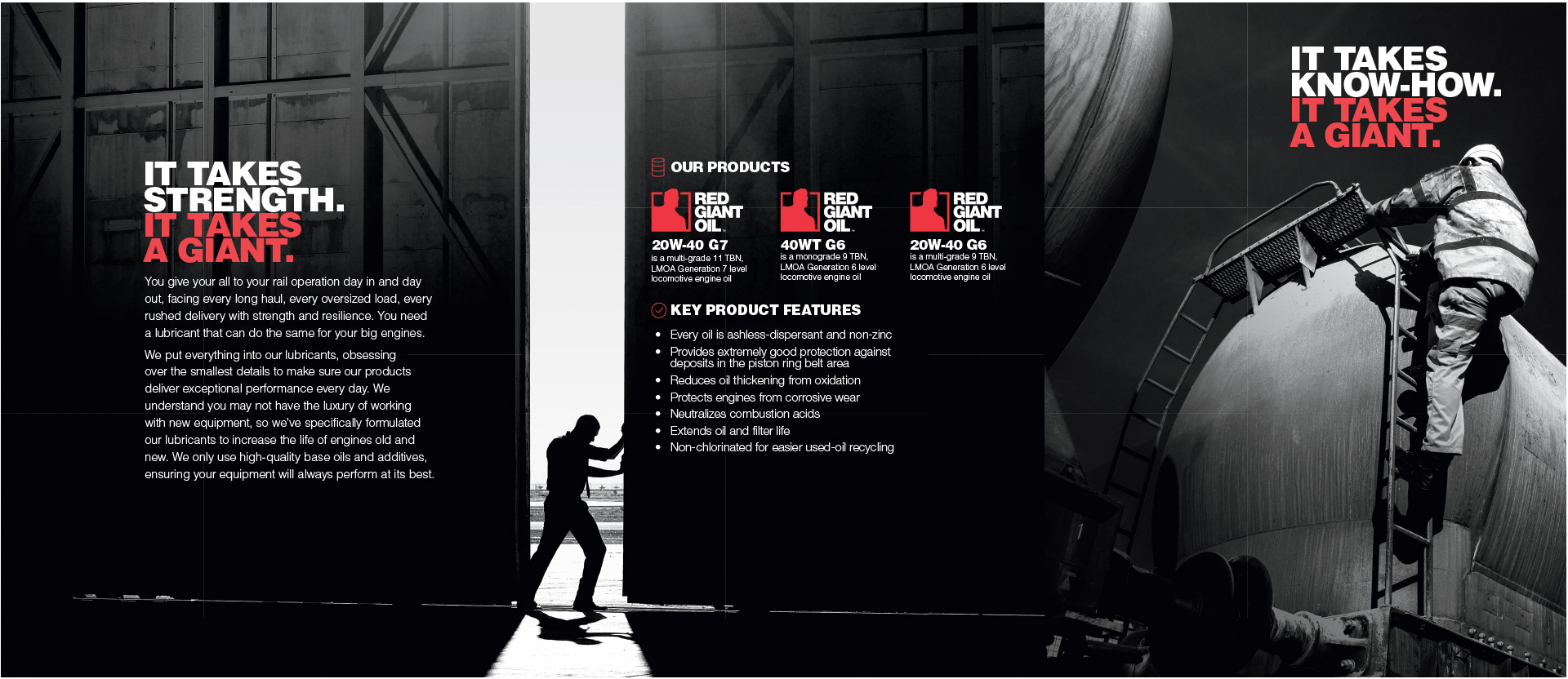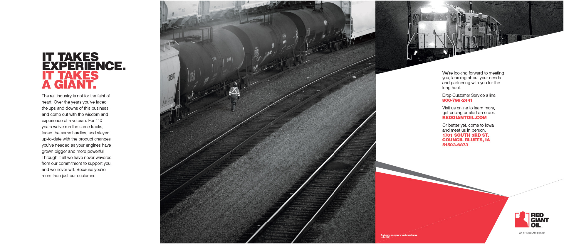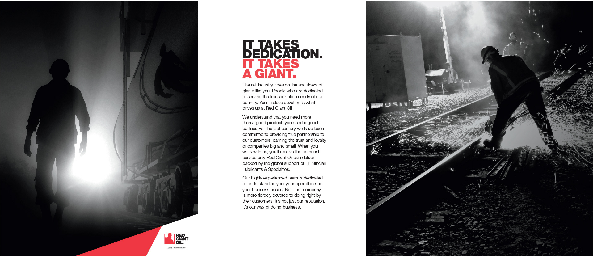 Red Giant Oil had a 100-year history it was proud of, and a bright future as part of HF Sinclair. It was time to modernize the recognizable, trusted brand to position itself for the future, raise awareness across the rail and inland marine industries, and expand into Class II and III markets. I wrote the new "it takes a giant" mantra, as well as the brand endorsement strategy for RGO and all HF Sinclair companies, and directed a new visual identity to set the tone for a new era.