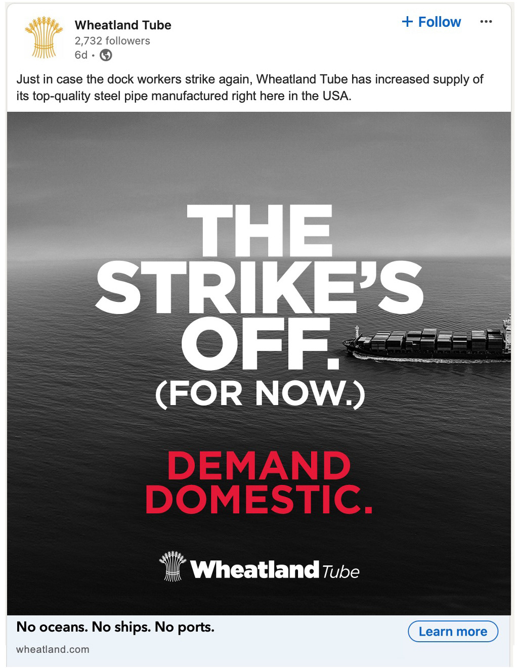 Tuesday, Oct 1, 2024, the Longshoreman’s union went on strike, shutting down every port in America and making overseas goods impossible to deliver. We knew what this meant to not only our client but the thousands of impacted customers. Wednesday, Oct 2, we had a compelling mini social campaign in market.